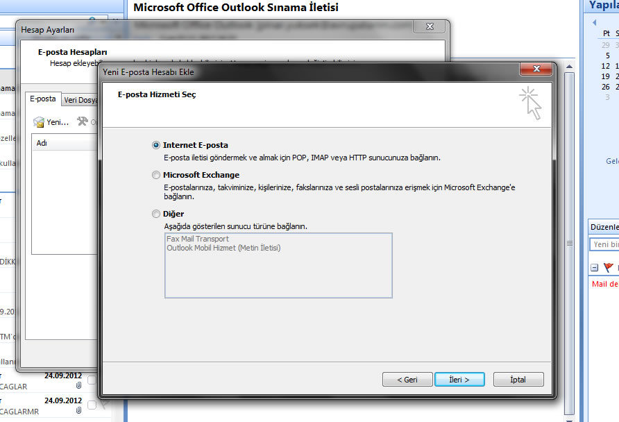 - Gelen ekranda "Internet E-Posta" seçeneğini işaretleyip ileri düğmesine tıklayın.