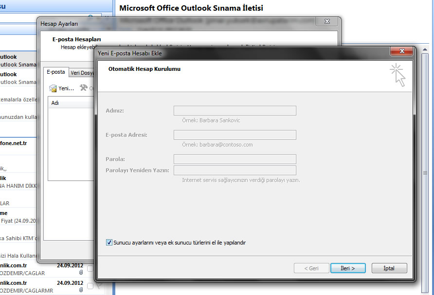 - Açılan pencerede alttaki "Sunucu ayarlarını veya ek sunucu türlerini el ile yapılandır" seçeneğini işaretleyip ileri düğmesine tıklayın.